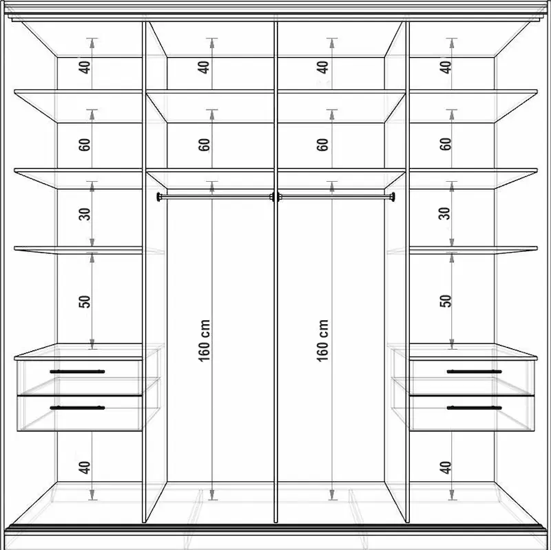 - ارتفاع قفسهها: ۳۰ تا ۴۰ سانتیمتر. این ارتفاع برای یک ردیف لباس تاشده (یا دو ردیف فشرده) و همچنین برای نگهداری کیفهای دستی و کفشهای بدون جعبه استاندارد است.