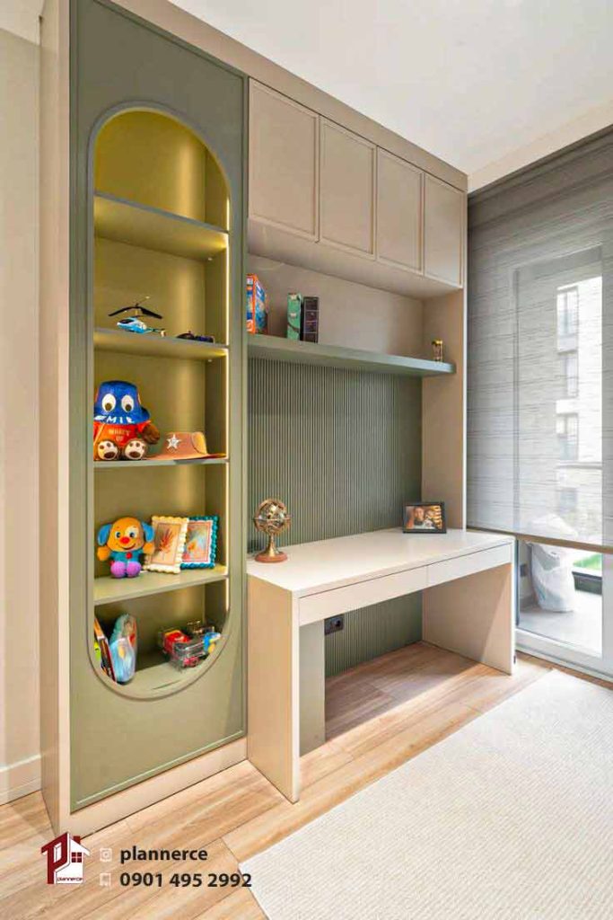 در این پروژه، متریال اصلی امدیاف انتخاب شده که به دلیل دوام بالا، قابلیت اجرای جزئیات ظریف و تنوع رنگی، گزینهای ایدهآل برای اتاق کودک محسوب میشود. ترکیب رنگ طوسی و سبز زیتونی، فضایی آرام، متعادل و در عین حال شاد ایجاد کرده است. رنگ طوسی بهعنوان پایه، حس نظم و سادگی را منتقل میکند و رنگ سبز با القای حس طبیعت، طراوت و آرامش، محیطی مناسب برای رشد ذهنی کودک فراهم میسازد.