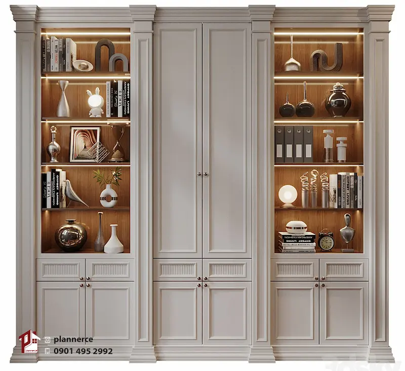 این کمد دیواری تنها یک عنصر تزئینی نیست، بلکه به صورت چندمنظوره طراحی شده است. بخش مرکزی آن به صورت کتابخانه و ویترین دکوری اجرا شده تا امکان نمایش کتابها، اکسسوریها و عناصر دکوراتیو فراهم شود. قفسهبندی باز در قسمت میانی، به فضا عمق بصری میدهد و از یکنواختی جلوگیری میکند.