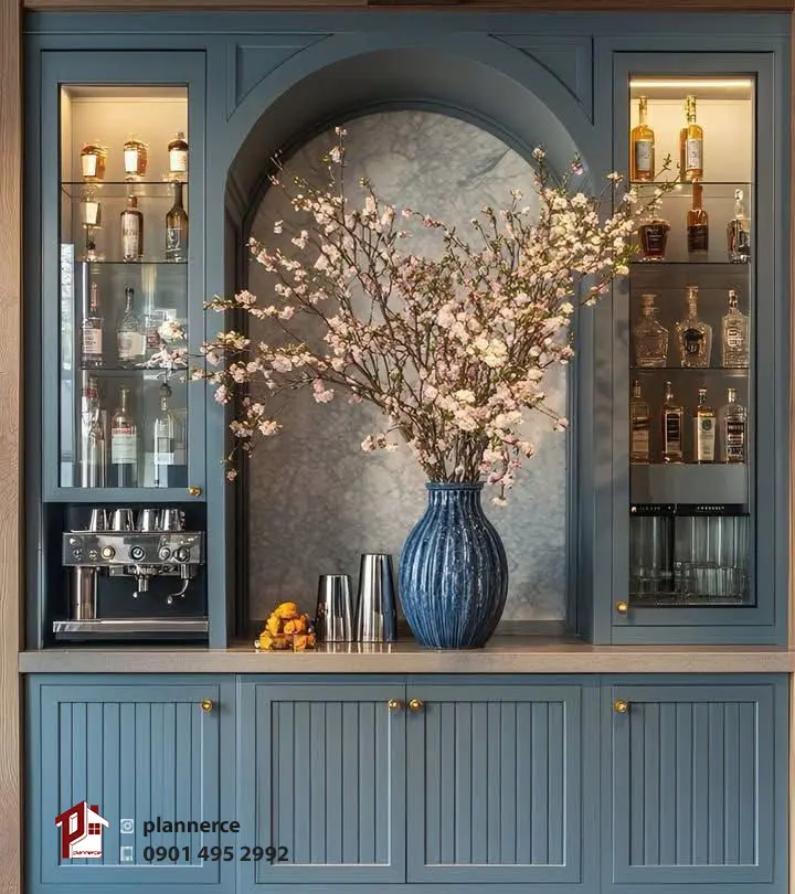 ارتفاع کمد تا سقف ادامه دارد که این موضوع علاوه بر افزایش فضای ذخیرهسازی، باعث شده فضا یکپارچهتر و لوکستر به نظر برسد. تاج بالایی با طراحی منحنی و منبتکاری شده، نقطه کانونی این کار محسوب میشود و جلوهای کاملاً اشرافی به پذیرایی میبخشد.